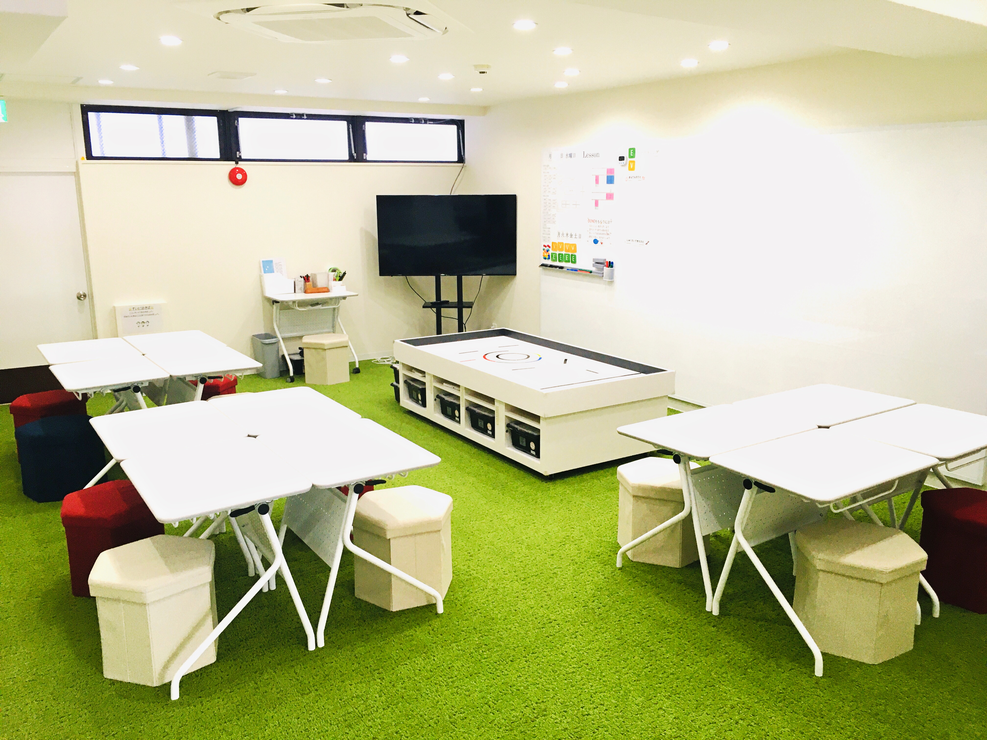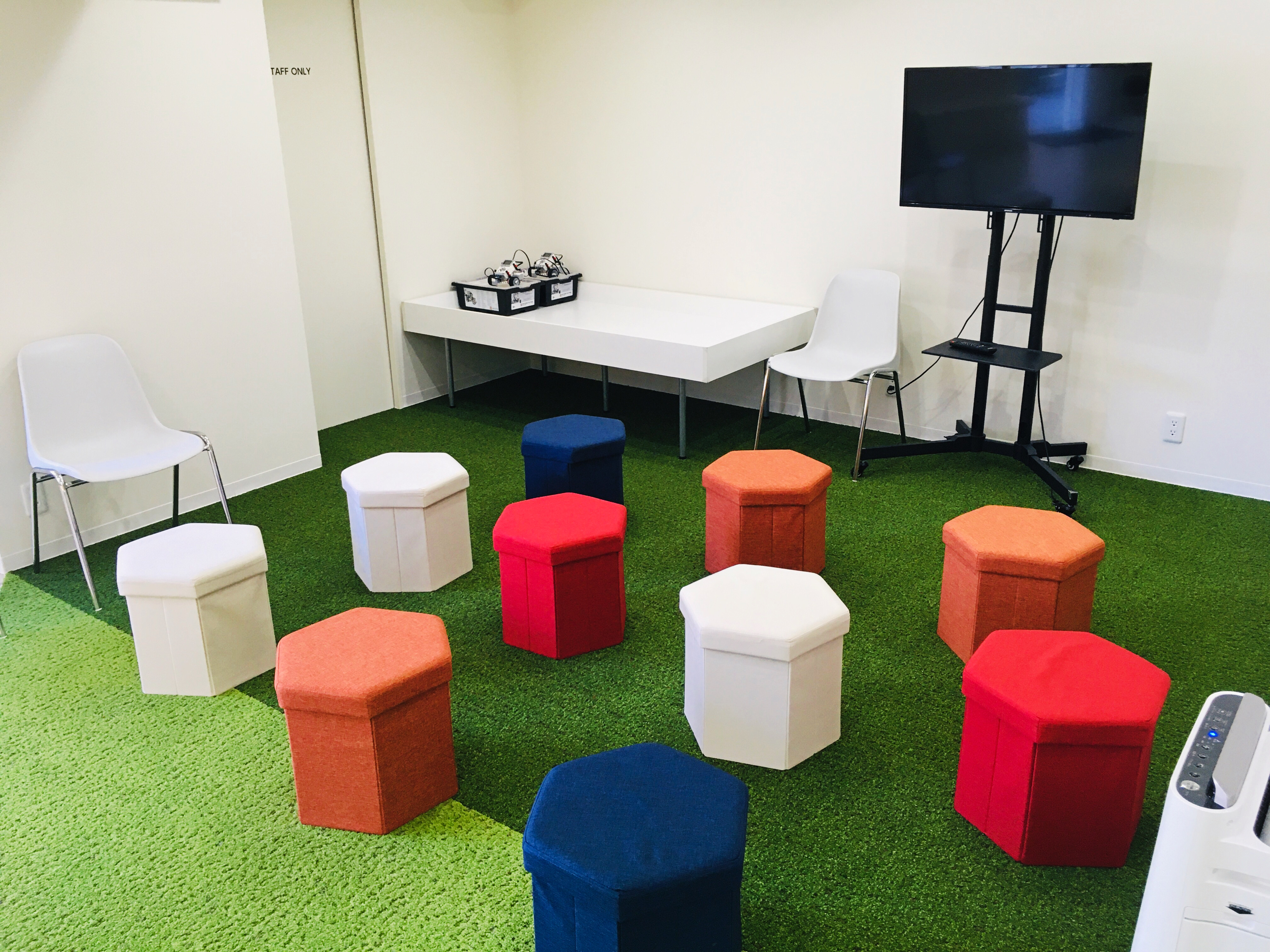 芝生のような絨毯にカラフルなスツールなどこだわり満点の室内です。