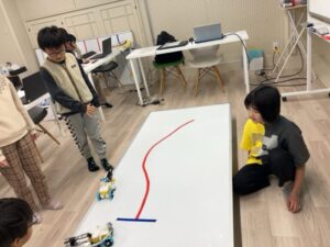 ロボットプログラミング教室のロボ団高槻校ですロボット作りが終わった後はいよいよプログラミングに挑戦! ロボット係・プログラミング係に分かれてミッションに挑戦していきます